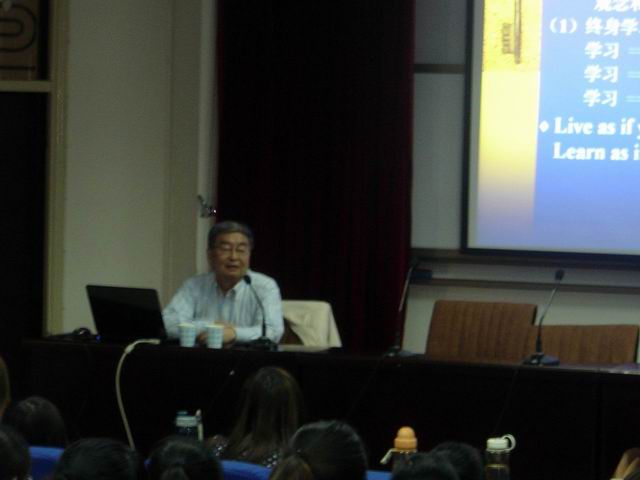 秦秀白教授曾任广东外语外贸大学“外国语言学及应用语言学研究中心”学术委员会副主任。兼职教授、博士生导师。他结合自己多年学习工作的经验,从英语本身特点谈起,提出英语学习应作为素质学习而不是一种工具,要克服英语学习功利性,把英语教学纳入素质教育轨道。秦教授的英语学习面面观包括自主学习观、体验学习观、创新学习观等多个方面。他鼓励同学们多读书,努力做到“工具性”和“人文性”的和谐统一,抵制当前“快餐式阅读”、“强迫阅读”和“强迫写作”的倾向,以避免“思辨缺席,有应试技能缺乏深层阅读能力”。整个讲座中,秦教授运用了很多生活中的实例来论述问题。他严谨的学术态度、幽默的语言给同学们留下了深刻的印象。在最后的互动过程中,同学们踊跃提问,现场气氛热烈。