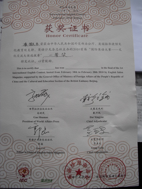 首届国际英语大赛“文化交流大使选拔赛”是由外交部主管,英语沙龙杂志社、英国驻华大使馆文化教育处共同主办的大型英语能力比赛。前外交部长李肇星先生为本次大赛题词,前外交部副部长吉佩定、国务院新闻办副局长吴伟、中国前驻联合国大使沈国放以及包括英美在内的英语国家驻华使馆主管教育的官员出席了在北京举行的大赛新闻发布会。这是国内首届以文化交流为主题的大型英语赛事,比赛内容突破了学校课本的范围,以介绍中国文化为主线,注重口头表达能力和沟通交流能力。大赛的目的是推荐选拔出未来的文化使者,促进中外文化交流,培养、储备中国对外交往的人才。 本次大赛由地区选拔赛、省总决赛以及全国总决赛组成。比赛内容涉及笔试、听力、辩论、演讲、才艺表演、看图说话以及机智问答等环节,主要考察选手对中西方文化的了解、英语口语、逻辑思维等能力。我校英语071班凌傲冬顺利通过河南赛区的初赛(写作)和复赛(演讲和评委提问),和其他两名选手代表河南省(大学组)参加了2010年2月18日至21日在北京举行的全国总决赛。经过听力测试、口语交流、评委提问(即兴问答)和辩论赛等多个环节的激烈角逐,凌傲冬同学从120名决赛选手中脱颖而出,最终进入前八名辩论决赛,并获得一等奖(其他七名选手分别来自广东外语外贸大学、上海财经大学、南京大学、云南财经大学)。 tyc41183太阳成集团近年来一直重视英语教学的改革与创新,不断提高教学质量,积极开展“英语角”、“英语演讲比赛”等二课活动,形成了良好的教风和学风。本次大奖的获得是我校英语专业长期加强语言综合能力培养的结果。