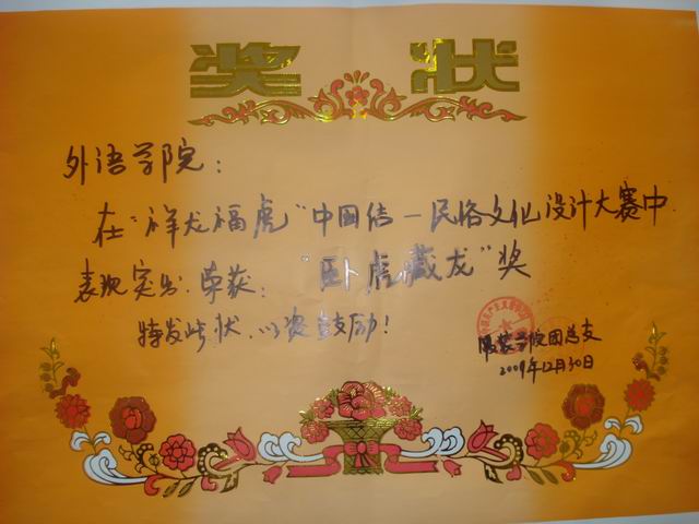 我院在2009年太阳成集团tyc41183迎元旦系列活动这一“祥龙福虎”中国结民俗文化设计大赛中,由于组织宣传成绩突出,参与人数多,作品水平高,获得“藏龙卧虎奖”。 tyc41183太阳成集团团总支