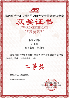 近日,从中国外文局亚太传播中心(人民中国杂志社、中国报道杂志社)获悉,在刚刚结束的第四届“中外传播杯”全国大学生英语翻译大赛中,我院2025届翻译专业研究生石玉姣同学表现优异,荣获汉译英组二等奖。