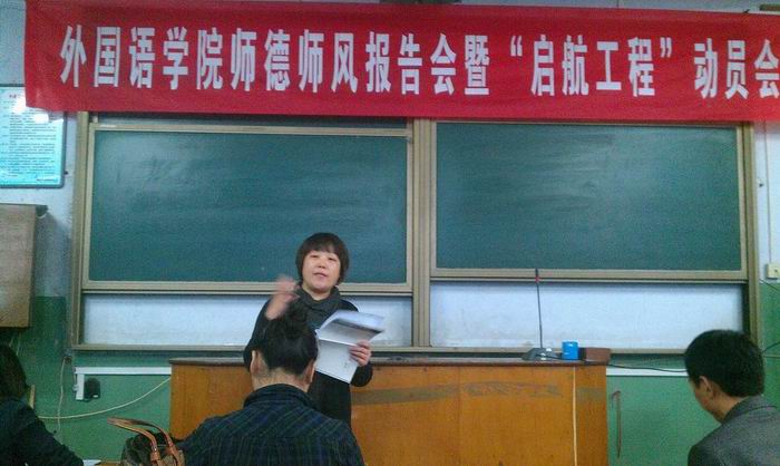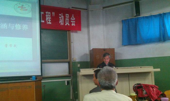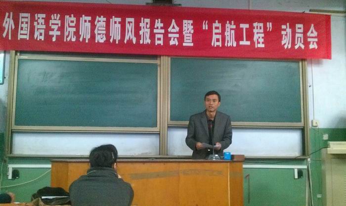 2012年10月26日下午,tyc41183太阳成集团召开师德师风报告会暨“启航工程”动员会,tyc41183太阳成集团全体教师共同学习了我校《教师课堂教学行为规范》和《教学事故认定及处理办法》。校师德师风报告团成员董学武教授为全体教师做了《师德的内涵和修养》的专题报告。董教授结合自己的生活和求学经历,论证了师德就是爱教育、爱学生的深刻内涵,师德修养就是师德认知和师德养成两部曲的实践总结。