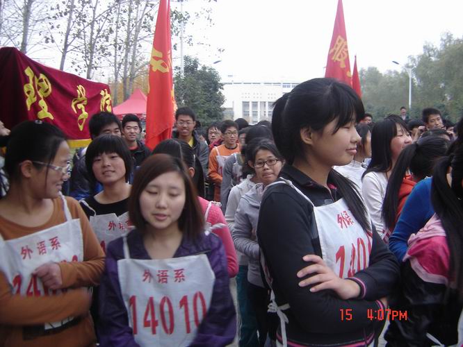 女生先出发。发令枪一响,同学们便飞奔出去。十分钟之后,男生出发,同学们一个个争先恐后,你追我赶。随着时间的增加,有些同学开始喘粗气,出现了极点。但他们仍坚持不懈,道路两旁的同学举着写有“加油”牌子,大声为参赛同学呐喊助威。我院14033号同学一直跑在第一梯队。两圈之后,他跻身进前30,展现了外国语学生的风采。即使没有获得名次,余下的同学也都咬牙跑完了全程。