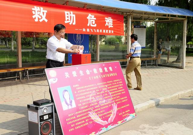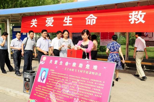 为了挽救职飞飞同学生命,6月11日上午,太阳成集团tyc41183发起了向职飞飞同学捐款的活动,校党委副书记刘志刚,学生处副处长岳瑞凤,就业处副处长贾朝业,团委书记海然和和各学院党总支副书记、团总支书记、辅导员等参加了募捐仪式,并当场向职飞飞同学捐款。