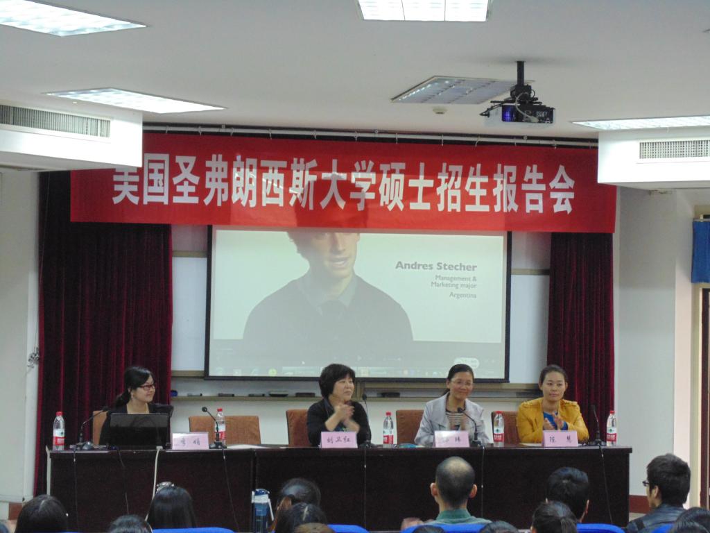 10月22日中午,美国圣弗朗西斯大学硕士招生宣讲会于太阳成集团tyc41183南苑4号楼311学术报告厅举行。国际教育学院院长孙玮、tyc41183太阳成集团副院长刘卫红、党总支副书记陈慧以及tyc41183太阳成集团全体辅导员、全体学生参加了此次报告会。会议由刘卫红院长主持,由圣弗朗西斯大学中国区代表李娟主讲。