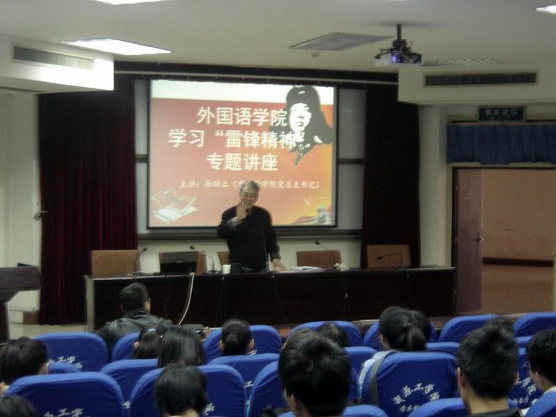 为了让大家更好地学习雷锋精神,我院特地邀请到了已退休的原经济管理学院党总支书记徐联正老师,他将自己的亲身经历和雷锋的事迹结合起来,展示了多幅照片,并讲述了很多感人的事迹,同学们也都认真地倾听着。讲座的最后,徐老师号召大家把雷锋精神和新的时代精神结合起来,刻苦学习,乐观向上,回报社会。讲座在同学们热烈的掌声中圆满结束。