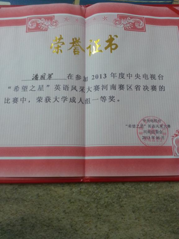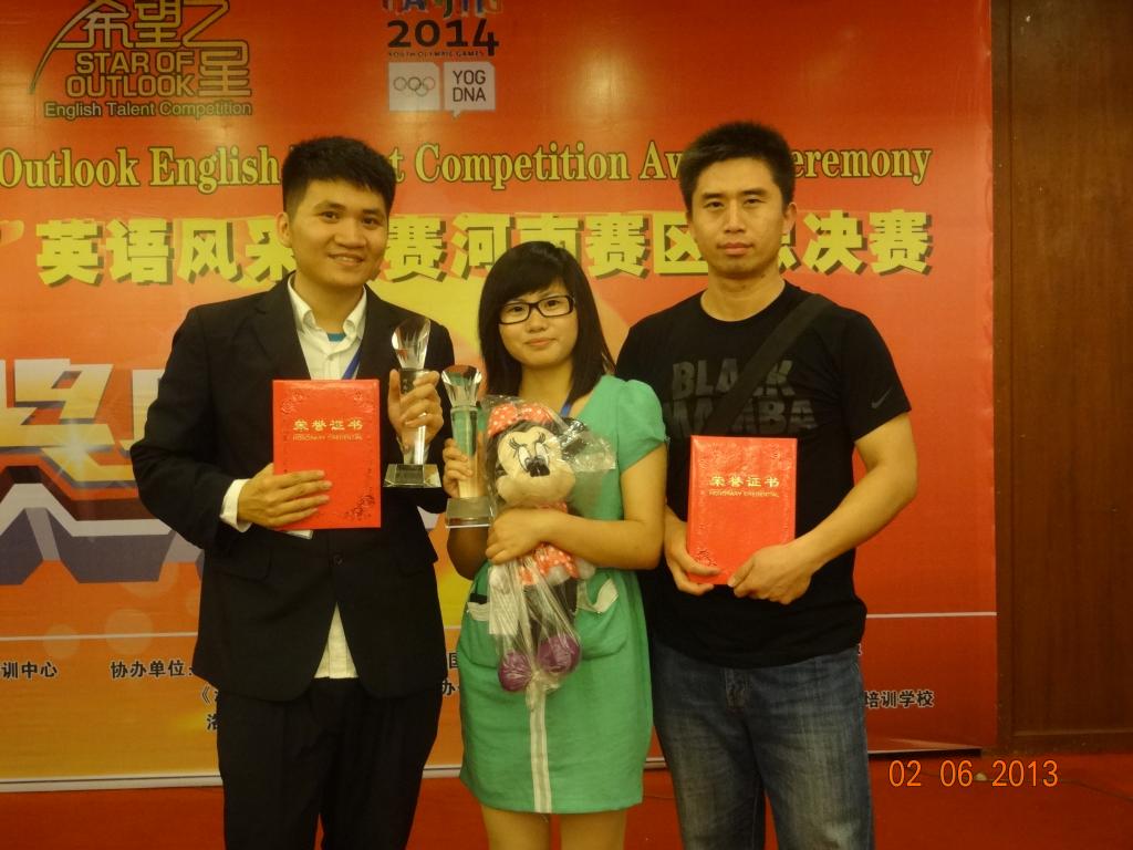 5月底,中央电视台“希望之星”英语风采大赛河南赛区选拔赛在郑州科技学院举行,在我校tyc41183太阳成集团领导的大力支持下,tyc41183太阳成集团由魏东峰老师指导的华莹同学和由郝玉娟老师指导的潘国军同学晋级到河南赛区总决赛。5月31日到6月2日,河南赛区总决赛在洛阳举行,魏东峰老师带队前往洛阳参加比赛,历经三轮角逐,我校两位同学在最后一轮十进五淘汰赛中脱颖而出,双双进入前五名,从而获得到北京参加比赛的资格,这是我校英语专业学生首次进入此类国家级级别比赛。华莹同学获得了季军和“最具机智灵活奖”两个奖项。(陈慧/文图)