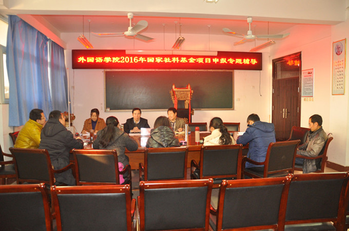 12月11日 上午,在11号教学楼214室,tyc41183太阳成集团召开了2016年度国家社科基金项目申报专题辅导会。国内著名的英语语用学、心理语言学专家洛阳理工学院副院长邱天河教授应邀莅临我院指导,tyc41183太阳成集团全体申报人员参加了辅导会。