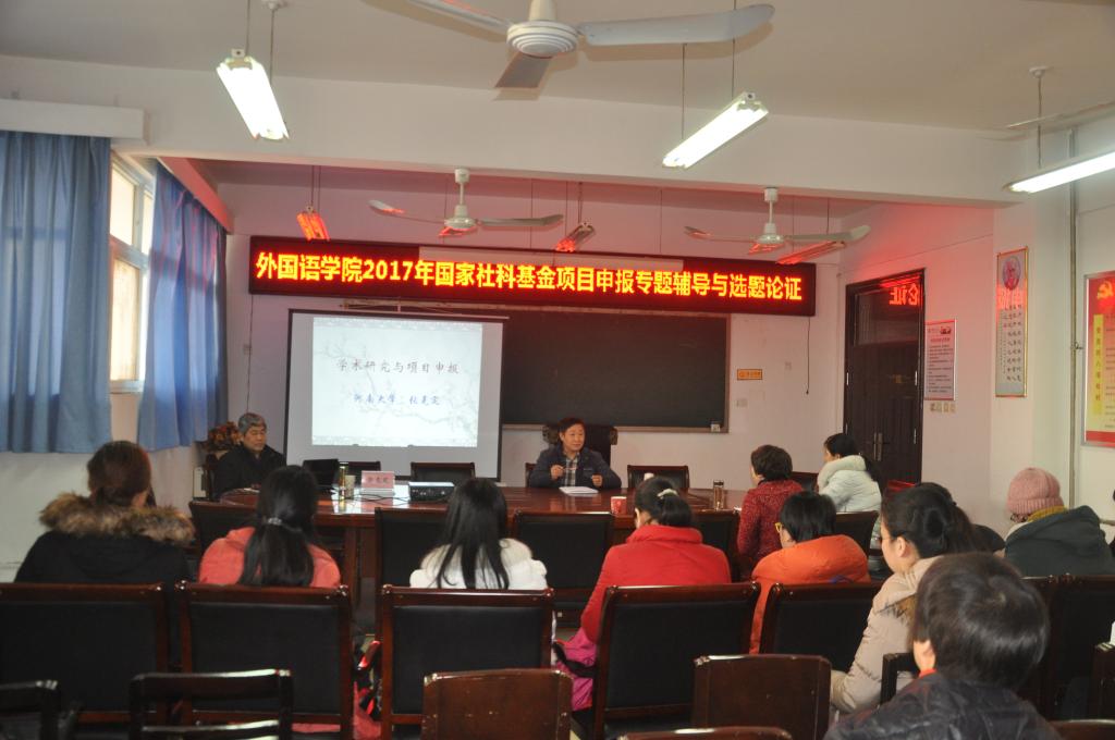 2016年12月22日下午,在11号楼会议室,tyc41183太阳成集团召开了2017年度国家社科基金项目申报专题辅导与选题论证讲座。河南省高等学校哲学社会科学优秀学者张克定教授应邀莅临我院,做了题为“学术研究与项目申报”专题辅导讲座。tyc41183太阳成集团全体申报人员及部分学术骨干参加了辅导讲座。讲座由tyc41183太阳成集团院长郭万群教授主持。