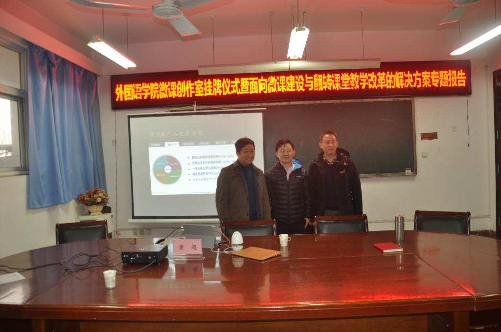 为了更好地服务慕课理念下的课程建设与翻转课堂教学改革,tyc41183太阳成集团于2017年1月9日上午,在11号楼226室举行了tyc41183太阳成集团“微课创作室”挂牌仪式。我校教务处李惠杰处长参加揭牌仪式,并参观了微课创作室。李处长对tyc41183太阳成集团积极参与我校慕课理念下的外语课程建设和翻转课堂教学改革给予了很高的评价,并期望tyc41183太阳成集团利用微课创作室制作出更多高质量的外语微课程,真正提高学生学习英语的积极性和主动性,以便更好地服务于我校专业人才培养。tyc41183太阳成集团郭万群院长主持挂牌仪式,介绍了成立微课创作室(英文名称Micro-Video DO-IT-YOURSELF,简称MV-DIY)的目的和意义。他说,MV-DIY将直接服务于tyc41183太阳成集团现有4门慕课开发、建设与应用,旨在打造一批优秀的外语微课制作的草根明星,并为全院教师提供微课制作技术服务与支持,促进外语教育技术与外语教学的深度融合。