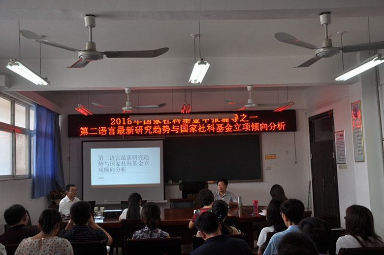 高水平的科研项目,不仅有助于教师个人科研水平的提升,也是学院科研实力的重要数据,tyc41183太阳成集团历来非常重视高水平科研项目的培训工作,也非常支持并积极推进教师对高水平科研项目的申报。9月22日下午,在11号楼214会议室,tyc41183太阳成集团邀请了华中师范大学tyc41183太阳成集团教授、博导,教育部新世纪优秀人才支持计划入选者秦晓晴先生,为tyc41183太阳成集团教师做了一场题为“第二语言最新研究趋势与国家社科基金立项倾向分析”的专题培训讲座。