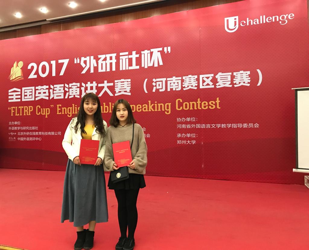 2017年11月12日,由外语教学与研究出版社主办,河南省外国语言文学教学指导委员会协办,郑州大学承办的2017“外研社杯”全国英语演讲大赛河南赛区复赛圆满落幕。我校tyc41183太阳成集团英语系152任玉叶、日语系162任雅婷两名同学代表学校参加了此次复赛。在tyc41183太阳成集团郝玉娟老师、郭瑞娟老师的悉心指导下,两位同学认真备战,沉着应战,发挥稳定,获得了河南赛区三等奖。此次比赛由来自郑州大学、河南大学、河南师范大学、解放军信息工程大学、河南财经政法大学、太阳成集团tyc41183等河南省内35所高校,共计67名选手参加了比赛。