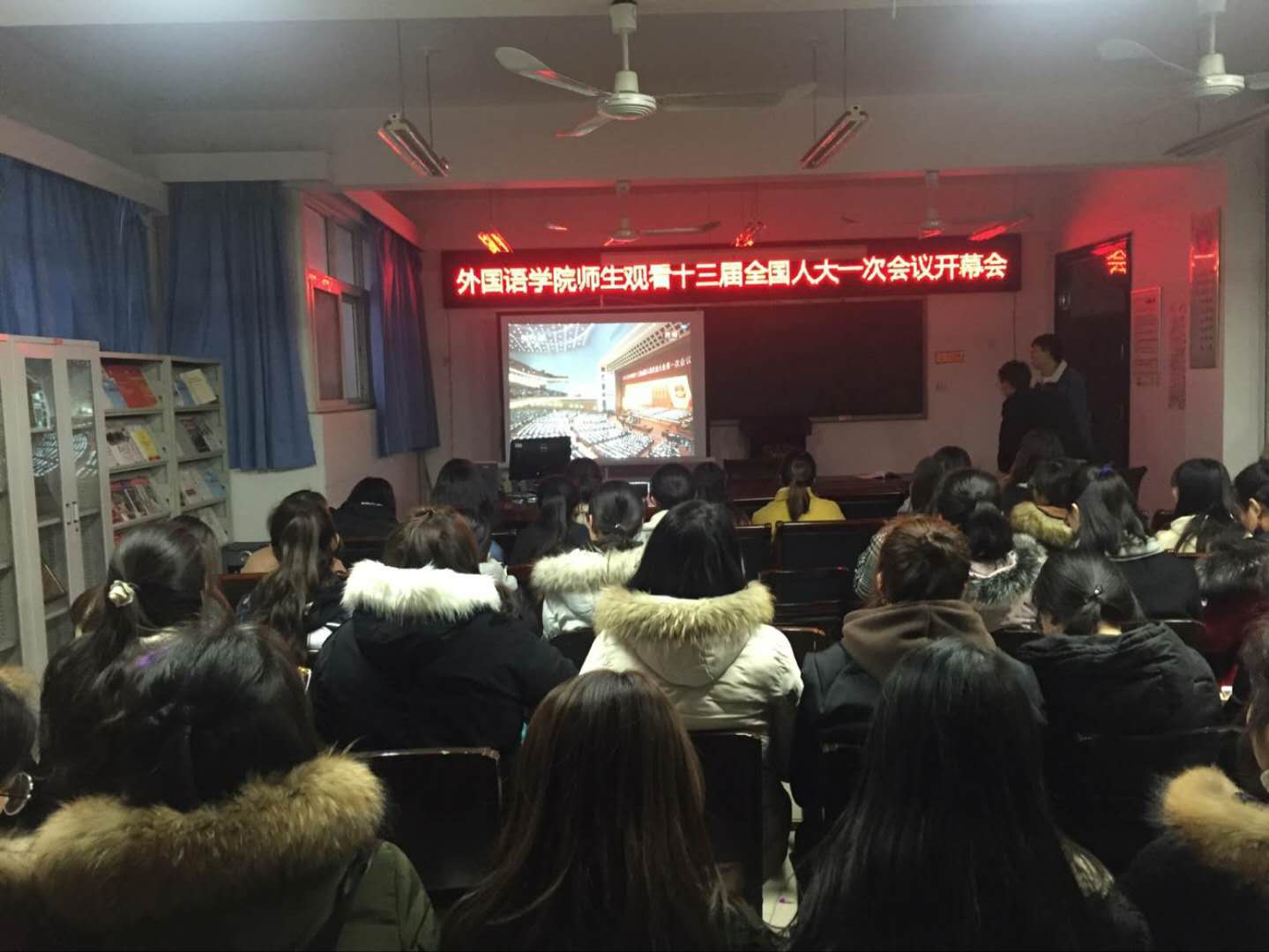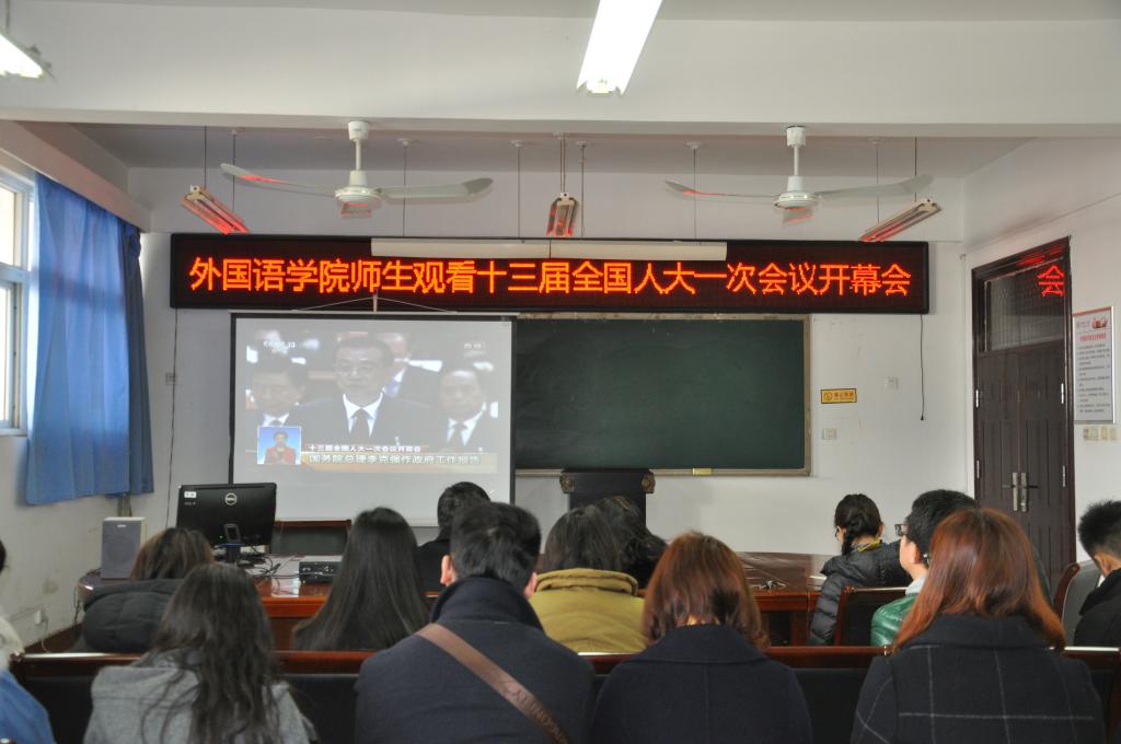 2018年3月5日上午九点tyc41183太阳成集团党总支组织学院师生在11号楼214集中收看了“十三届全国人大一次会议开幕会”,tyc41183太阳成集团党总支书记姚晓鸣、院长郭万群、副书记周全营、副院长柴高洁、院长助理马春丽以及没课的教师和学生参加了集中收看学习活动。