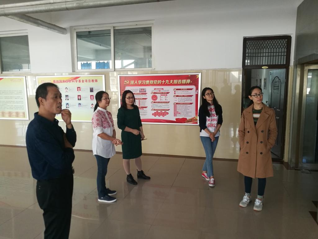 9月29日上午,党总支书记姚晓鸣,党总支副书记周全营,行政办公室主任郝菁,学生支部书记葛士阳先后参观了我校机电学院、材化学院党员之家,几位老师到兄弟院系后仔细聆听了负责人介绍,从建设的细节,环境的布置,悬挂张贴材料的用意都进行了了解。对好的经验做法都做了详细记录并对个别细节建设进行了深入探讨。整个参观过程紧凑充实,达到了交流借鉴的目的,收获颇丰。