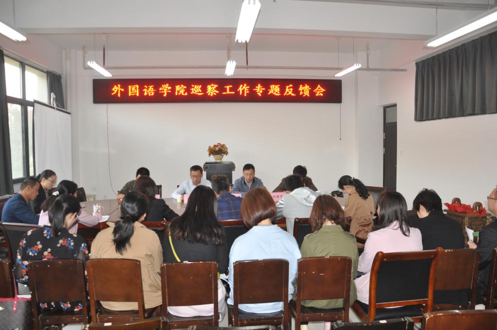 巡察工作专题反馈会,由tyc41183太阳成集团党总支书记姚晓鸣主持,学校第一巡察组组长李惠杰同志代表巡察组从三个部分反馈了巡察情况,重点提出发现的主要问题。随后,tyc41183太阳成集团姚晓鸣书记代表tyc41183太阳成集团党政班子表态,第一巡察组既肯定了外语学院近年来的教育教学发展和党建成绩,更指出了巡察发现的问题。对于巡察组提出的整改意见和要求,tyc41183太阳成集团一定坚持问题导向,全面推进整改落实;突出建章立制,常态长效抓好整改;用好巡察成果,持续推荐从严治党,全力推进教育教学、人才培养高质量发展;对标十九大精神、对标省委十届六次全会暨省委工作会议精神,对标“四个回归”,对标学校“大类招生、交叉培养、外语突出、实践达标”人才培养模式和“更名大学、取得博士学位授予权”的发展战略。