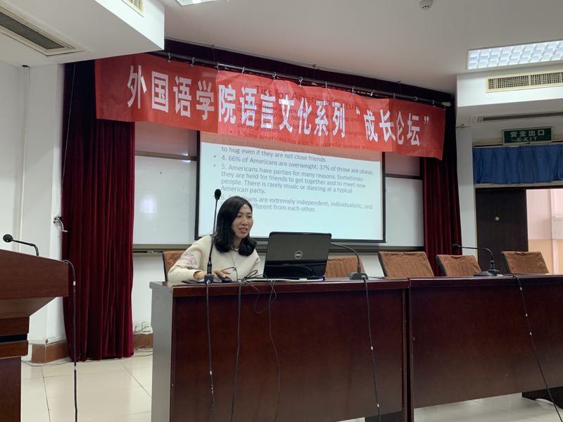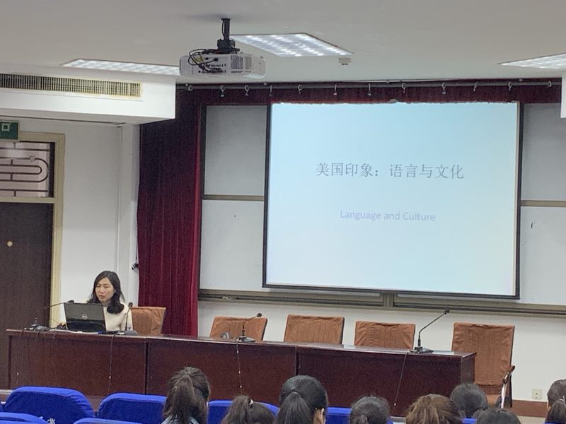为使学生更好了解关于英语国家的文化,加深对英语国家的印象;同时也为第九届外语文化节的开幕进行了积淀。4月26日下午特地邀请我院赴美访学的仝志敏老师在四号教学楼311学术报告厅为英语专业学生开展关于“美国印象:语言与文化”的成长论坛讲座。参加讲座的有我院赴美访学的仝志敏老师,2017级和2018级英语专业全体学生。