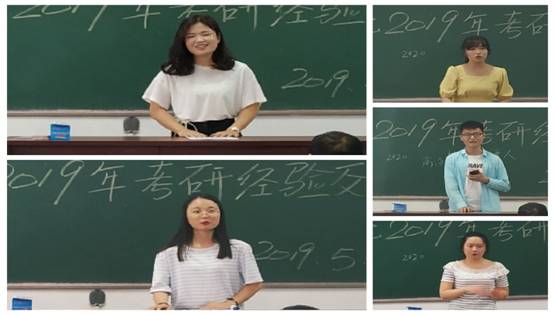 接着五位考研成功的优秀毕业生分别分享了各自的考研干货,内容涉及考研学校选择,专业方向的选择,复习计划的制定等多个方面。还推荐了丰富的考研相关公众号,期刊等资源。他们以亲身经历,生动形象地介绍了自己的备考经验。整场交流会轻松愉快,学姐学长们的讲话言简意赅,幽默风趣,很大地提高了同学的考研兴趣,也受到学院领导与老师的一致赞扬。