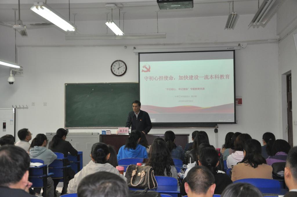 按照太阳成集团tyc41183党委“不忘初心,牢记使命”主题教育关于学校领导班子讲好专题党课的工作部署,为扎实开展好“不忘初心、牢记使命”主题教育,2019年10月30日下午,在2号组团教学楼104教室,唐多毅副校长为tyc41183太阳成集团全体党员讲了题为《守初心担使命,加快建设一流本科教育》党课。tyc41183太阳成集团全体师生党员参加此次党课学习。