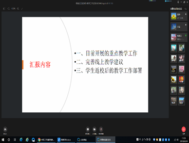 最后,杨院长汇报了近段时间我院正在开展的教学重点工作,基于学校和学院教学督导反馈,对如何进一步完善线上教学,从教学设计、教学内容、教学组织、课程考核四方面,提出了具体改进建议,并对学生返校后的教学工作提前做了初步部署。