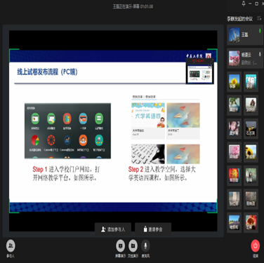 首先,大学外语二部翻转外语实验小组的三位成员代表依次发言分享了经验。李佳老师和张丽君老师分别以2019级国际化A班和翻转外语B班为例,介绍了我校分类开展翻转外语改革的实施情况,学生的学习情况,问题与建议以及教学成效。闫秋霞老师基于实验调查数据,汇报了参与实验的学生的学业成绩和四级通过情况,该教学实验初步效果明显。接着计算机辅助教学部王磊老师以《大学英语四》课程为例,就期中线上测试发布流程和实施要求等,运用学习通软件给全体老师做了操作演示。