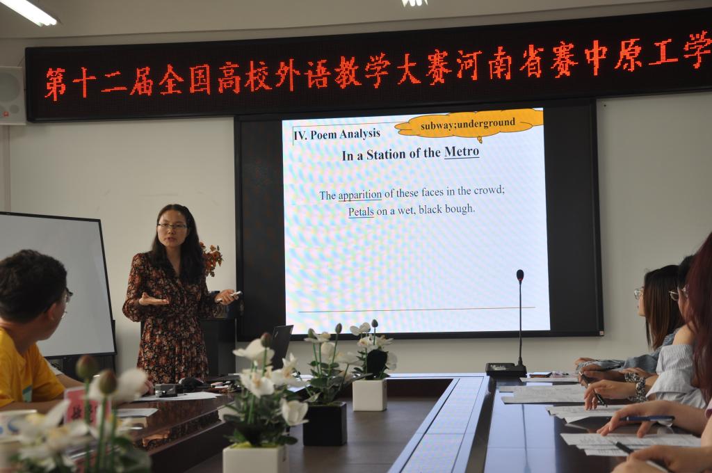 本次讲课比赛的形式为一堂20分钟的授课。开始3-5分钟为综述时间,由选手陈述对授课文本的整体教学设计。接下来15-17分钟为模拟课堂授课时间,选手针对整体教学设计中某一具体板块进行教学展示。选手需制作PPT课件辅助教学,所用教材应为国家级规划教材。评分标准是百分制:教学内容设计20%+教学过程设计35%+综合素质20%+教学创新25%。经过激烈角逐,专家打分评议,由教师发展中心主任孙敬霞公布选手最终成绩,并宣布推荐本科英语专业组刘丽老师、本科大学英语视听说组王磊老师、本科大学英语综合组张丽君老师,将代表我校参加第十二届全国高校外语教学大赛河南省赛。