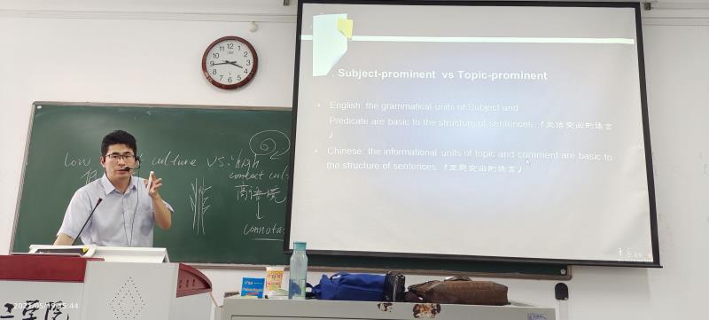 随后,冯展老师以一首彭斯的经典诗歌《一朵红红的玫瑰》对比我国著名诗人欧阳修的诗歌《生查子·元夕》,惟妙惟肖地向学生展示出中国与西方爱情诗歌在语言、意境、情感三方面的差异。在爱情诗歌的表达上,西方浓郁炽烈如火“my love’slike a red red rose”的简洁清晰与东方柔情似水“月上柳梢头,人约黄昏后“的含蓄婉约形成了强烈的反差。他们各自摇曳着独特的风姿,散发出截然不同的芬芳,闪烁着截然不同的民族色彩。接着冯老师分析为何语言表达在不同文化中形成如此大的差异,在文化研究中,文化具有语境性,并且根据信息在传播过程中对语境的依赖程度将文化划分为“低语境文化”(low-context culture)和“高语境文化”(high-context culture)。在高语境文化中,人们交际时绝大部分信息存在语境中,由社会文化环境和情景来传递,内化于个人的记忆思维深处,只有少量的信息由显性的语码负载;低语境的交流主要载体是语言本身。在高语境文化中,信息的传达主要依赖语境;而在低语境文化中,信息传达依赖信息编码。作为高语境代表的中文和低语境代表的英文,注定表达方式一种依靠“会意”,一种依靠“言传”;一种表达方式间接、含蓄、婉转;一种表达方式比较直接、大胆、坦率。探究高低语境文化下中英诗歌表述的差异形成原因,有利于避免误解和冲突,实现成功的跨文化交际。