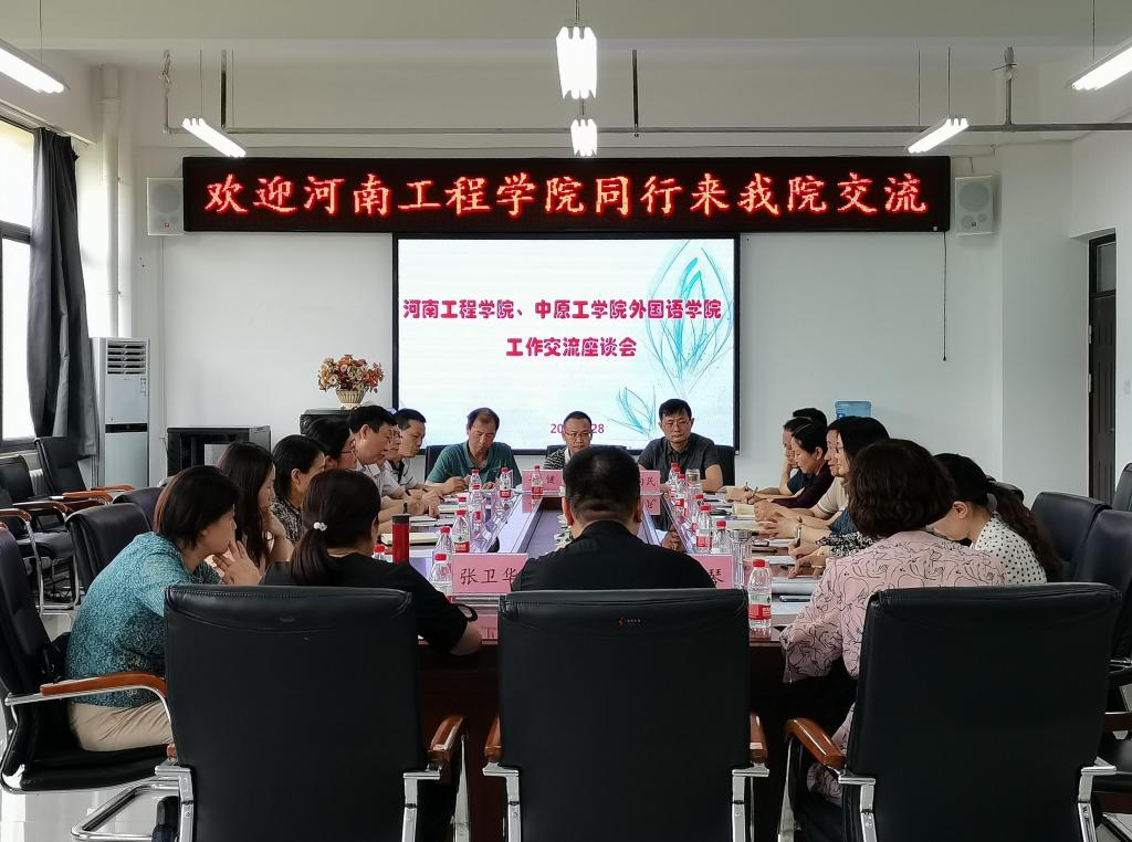 5月28日下午,河南工程学院外语学院书记王志伟、院长高稳一行10人来我院调研交流。我院院长郭万群、院党委书记姚晓鸣、院党委副书记周全营、副院长杨道云、副院长柴高洁以及系部主任代表参加了座谈会。