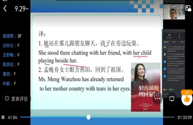 教学团队以线上教学为切入点,在内容、载体和方法等方面勇于探索,着力开展课程思政的新探索和新实践,结合今年夏秋国内外形势,尤其是中国共产党建党100周年、郑州取得防汛救灾和疫情防控胜利、孟晚舟回国等重大事件,深挖大学英语课程家国情怀、生命健康、社会责任感、爱与感恩、公共安全等思政育人元素,有效融入到“三位”(设定目标、强化技能、提升质量)“四线”(深入了解学生需求、课前组织线上时政热点讨论、课中营造正能量直播氛围、课后推送主旋律英语学习资源)一体并行的教学模式中,建立课程思政教学案例库,持续保持大学英语与思政教育同频共振,实现知识传授和价值引领有机统一。