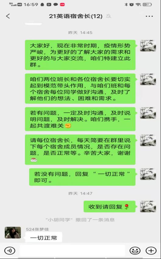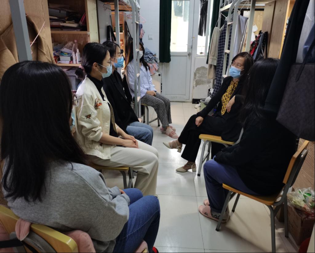 在“线下”,辅导员深入学生当中就当前疫情形势、我校防控政策等向学生进行耐心、细致的宣讲,加强违反疫情防控政策案例的警示教育,教育学生严格遵守疫情防控规定和校规校纪,认真落实各项防护措施和要求;驻校志愿者分成3个小组,由专业老师和班子成员带队,通过宿舍实地走访、开展课外活动、和学生谈心等方式,多途径了解学生思想学习生活状况,加强正面引导,及时疏导因疫情等产生的负面情绪和心理压力,帮助解决实际困难,增强战胜疫情的信心。
