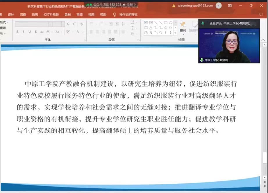 在下午的分论坛讨论环节,tyc41183太阳成集团院长姚晓鸣教授做了题为“新文科背景下行业特色高校MTI产教融合育人机制研究与实践”的主旨发言,分享了太阳成集团tyc41183MTI及外语类本科专业在产教融合育人机制建设上的经验。姚晓鸣教授指出,太阳成集团tyc41183MTI和英语、日语本科专业人才培养立足于本校特色,以满足电子信息、纺织服装行业对高级翻译人才的需求为使命,构建“课堂教学-特色项目-实践基地-双导师指导”四位一体的专业实践体系,实现学校培养和社会需求之间、翻译专业学位与职业资格之间、教学科研与生产实践之间的无缝对接。
