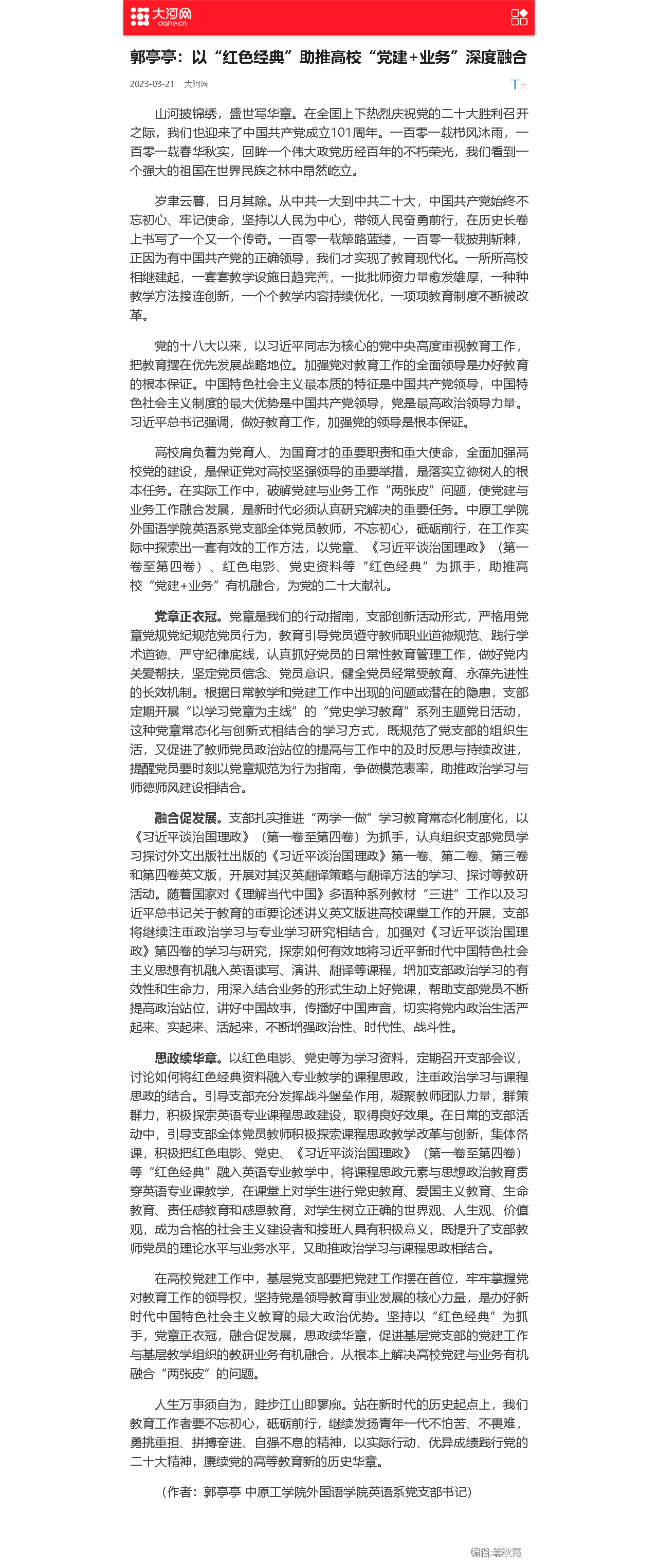 高校肩负着为党育人、为国育才的重要职责和重大使命,全面加强高校党的建设,是保证党对高校坚强领导的重要举措,是落实立德树人的根本任务。在实际工作中,破解党建与业务工作“两张皮”问题,使党建与业务工作融合发展,是新时代必须认真研究解决的重要任务。tyc41183太阳成集团英语系党支部全体党员教师,不忘初心,砥砺前行,在工作实际中探索出一套有效的工作方法,以党章、《习近平谈治国理政》第一卷至第四卷、红色电影、党史资料等“红色经典”为抓手,助推高校“党建+业务”有机融合,为党的二十大献礼。