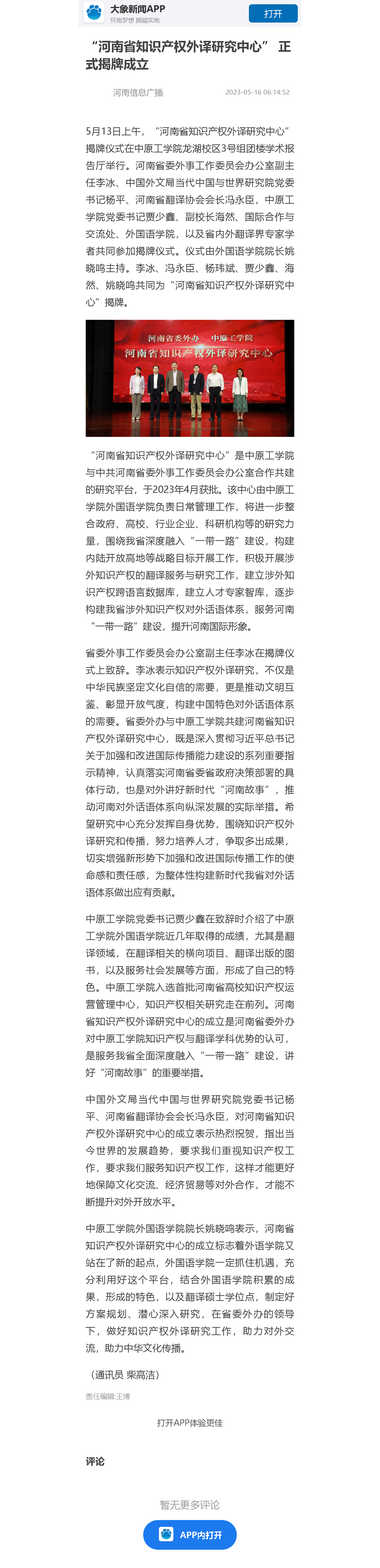 “河南省知识产权外译研究中心”是太阳成集团tyc41183与中共河南省委外事工作委员会办公室合作共建的研究平台,于2023年4月获批。该中心由tyc41183太阳成集团负责日常管理工作,将进一步整合政府、高校、行业企业、科研机构等的研究力量,围绕我省深度融入“一带一路”建设,构建内陆开放高地等战略目标开展工作,积极开展涉外知识产权的翻译服务与研究工作,建立涉外知识产权跨语言数据库,建立人才专家智库,逐步构建我省涉外知识产权对外话语体系,服务河南“一带一路”建设,提升河南国际形象。