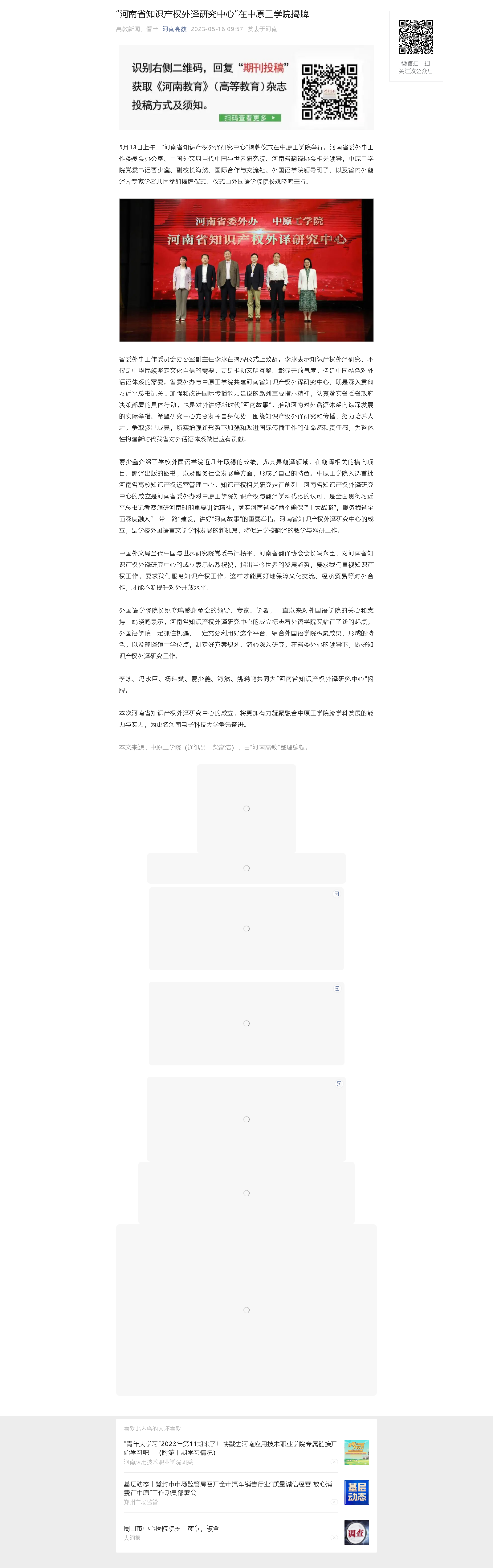5月13日上午,“河南省知识产权外译研究中心”揭牌仪式在太阳成集团tyc41183举行。河南省委外事工作委员会办公室、中国外文局当代中国与世界研究院、河南省翻译协会相关领导,太阳成集团tyc41183党委书记贾少鑫、副校长海然、国际合作与交流处、tyc41183太阳成集团领导班子,以及省内外翻译界专家学者共同参加揭牌仪式。仪式由tyc41183太阳成集团院长姚晓鸣主持。