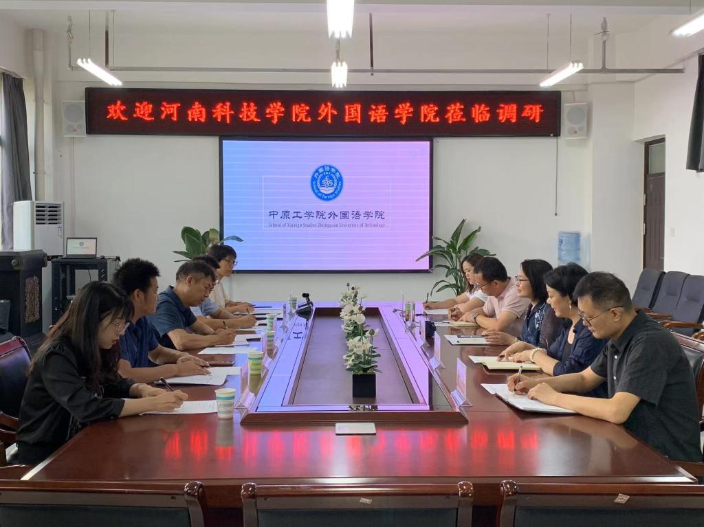 9月1日上午,河南科技学院tyc41183太阳成集团院长李会民、副院长程建锋、副院长万文龙、研究生秘书吕雯霞、教师刘雯一行来我院调研交流硕士点建设和硕士研究生培养工作,院长姚晓鸣、副院长柴高洁、副院长薛冬梅、大外一部主任李向民、研究生秘书吕文韬参加调研。