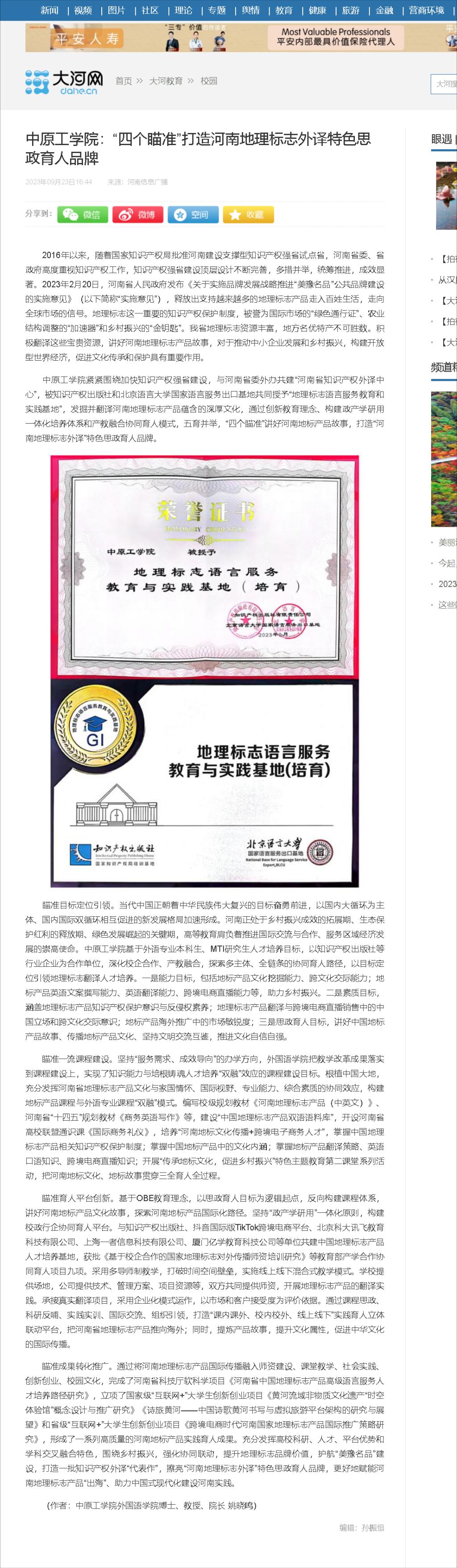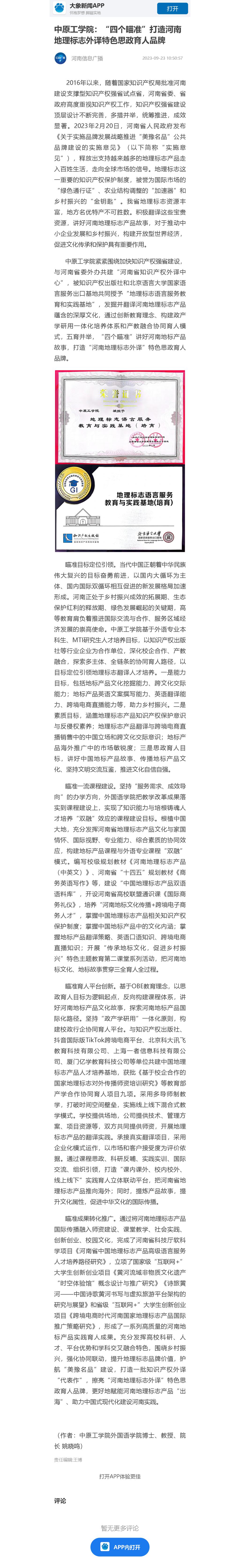 太阳成集团tyc41183紧紧围绕加快知识产权强省建设,与河南省委外办共建“河南省知识产权外译中心”,被知识产权出版社和北京语言大学国家语言服务出口基地共同授予“地理标志语言服务教育和实践基地”,发掘并翻译河南地理标志产品蕴含的深厚文化,通过创新教育理念、构建政产学研用一体化培养体系和产教融合协同育人模式,五育并举,“四个瞄准”讲好河南地标产品故事,打造“河南地理标志外译”特色思政育人品牌。