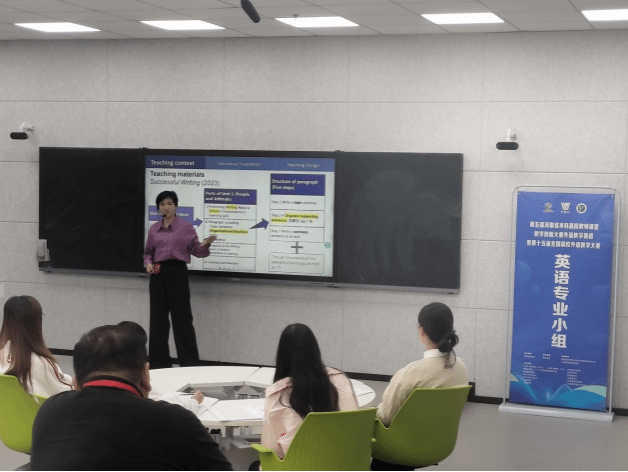 第五届河南省本科高校教师课堂教学创新大赛外语教学赛道暨第十五届全国高校外语教学河南省赛旨在服务教育强国战略,推进教育数字化战略行动,全面提高人才培养质量。本届河南省英语教学组(英语专业小组)决赛由河南省教育厅主办,许昌学院承办,河南省高等教育学会外语教学研究分会和上海外语教育出版社联合协办。比赛形式为“20分钟线下授课”,包括3-5分钟教学综述及15-17分钟的模拟课堂授课。金茹花老师将教学内容与人工智能深度融合,以新颖的教学设计、扎实的专业素养和语言功底,赢得了评委和观众的肯定。