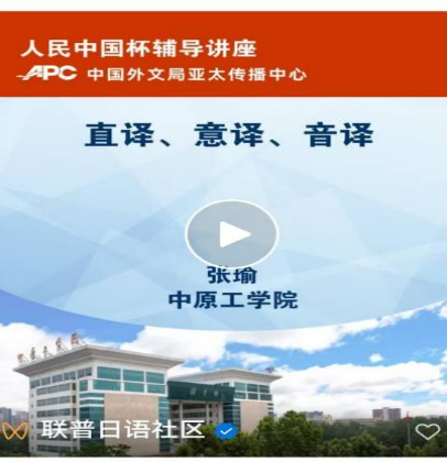 近日,第七届“人民中国杯”日语国际翻译大赛开赛,大赛期间,我院日语专业张瑜博士应主办方之邀,为参赛选手及日语学习爱好者开展了一场关于翻译方法的公开辅导讲座。张博士在30分钟的视频讲座中,饶有趣味地讲解了直译、意译与音译这三种主要翻译方法,并借具体案例剖析了其在不同情境下的运用及技巧,在日语界引起了广泛关注。