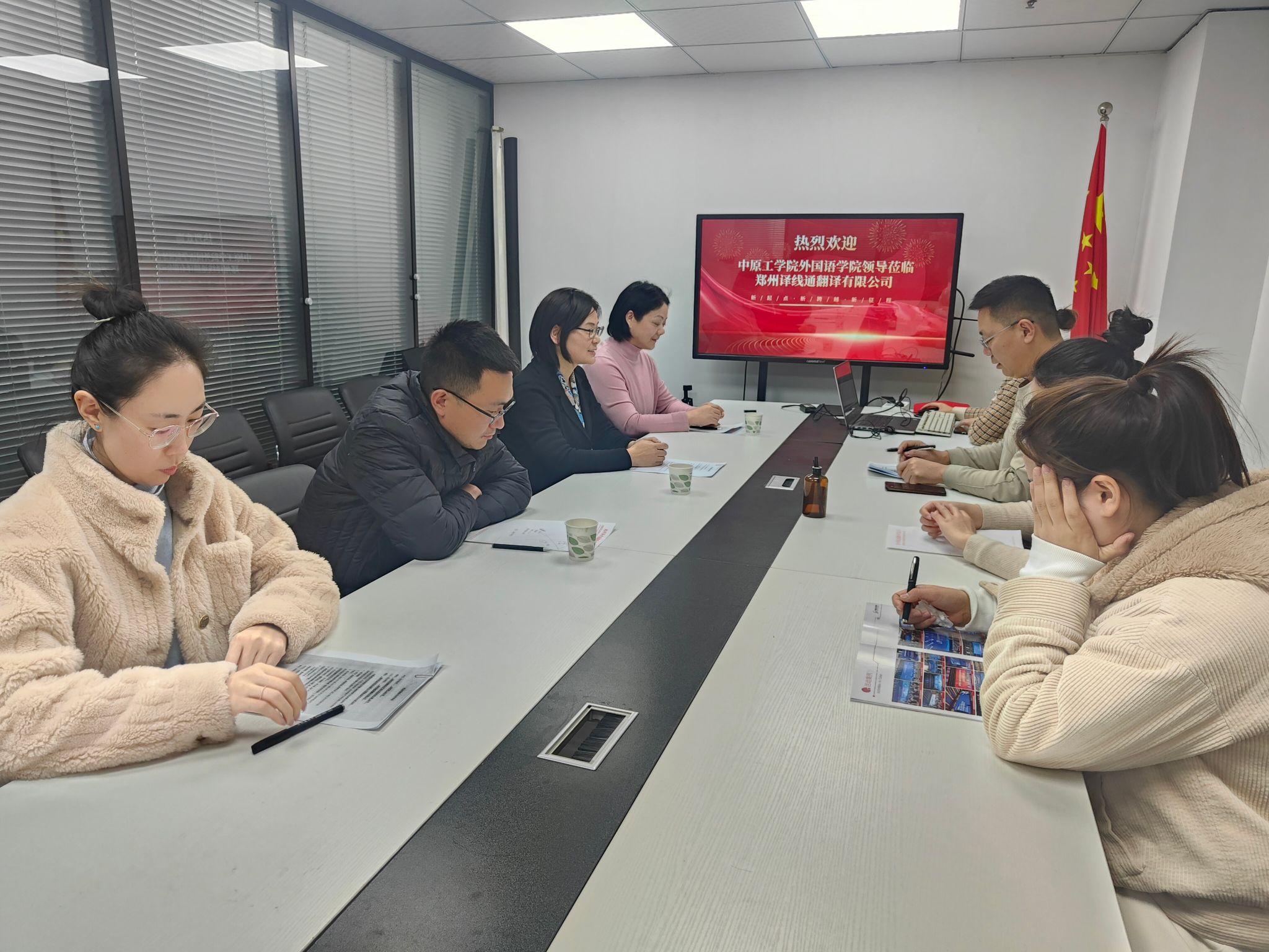 为持续深化校企合作,扎实推进我院与郑州译线通翻译有限公司关于河南省本科高校大学生校外实践教育基地共建,12月5日上午,学院院长姚晓鸣、副书记常潞炜、副院长薛冬梅、办公室主任郝菁一行4人赴郑州译线通翻译有限公司开展访企拓岗与合作洽谈。郑州译线通翻译有限公司总经理张富磊、运营经理翟小娟等参加座谈交流。