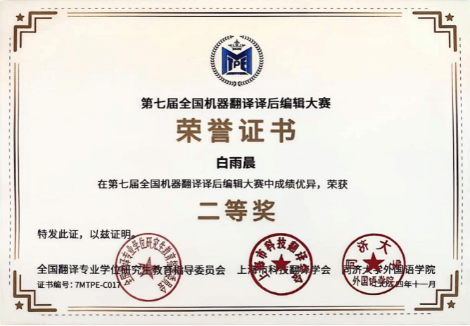 近日,由全国翻译专业学位研究生教育指导委员会指导,上海市科技翻译学会和同济大学tyc41183太阳成集团联合主办的 “第七届全国机器翻译译后编辑大赛” 圆满落幕。tyc41183太阳成集团翻译硕士研究生白雨晨获全国二等奖。