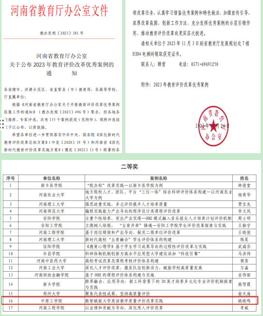 近日,河南省教育厅办公室下发了《关于公布2023年教育评价改革优秀案例的通知》(教办发规〔2023〕381号),我院姚晓鸣教授团队申报的《数智赋能大学英语教学质量评价改革实践》获河南省教育评价改革优秀案例二等奖。