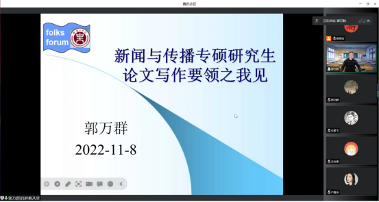 11月8日晚上,tyc41183太阳成集团线上召开了研究生科学道德与学风建设系列活动,邀请郭万群教授做了题为《新闻与传播专硕研究生论文写作要领之我见》的讲座。会议由副院长柴高洁主持,tyc41183太阳成集团全体研究生参加讲座。