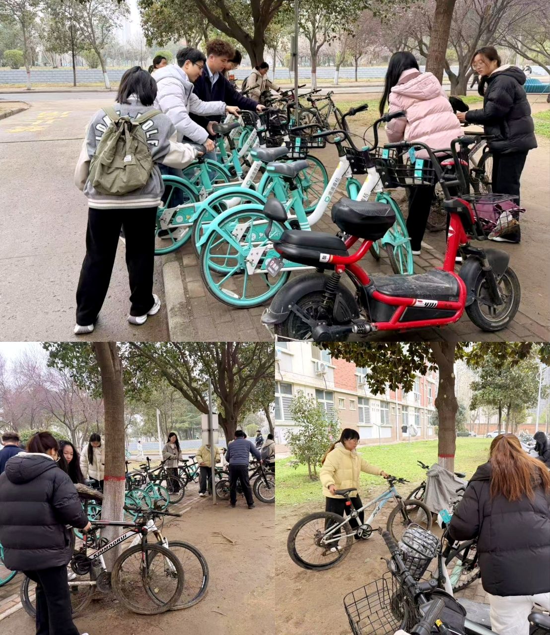 南苑学生公寓二号楼、三号楼周边是同学们个人自行车及校园共享单车集中停放区,由于空间有限且长期无人使用自行车较多,停放区内自行车摆放随意,比较杂乱,严重影响使用效率。志愿者们以此为切入点,细致调整停车角度,使其"车头朝外、间距均匀",将长期无人使用的自行车集中摆放以节省空间,将违停的自行车放回指定区域。经过大家努力,原本杂乱的停车区域变得井然有序,为春日校园增添了一道文明风景线。