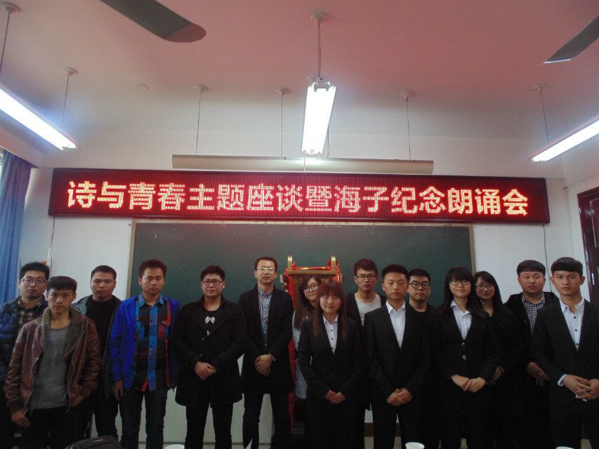 为促进诗歌爱好者之间的交流,增加学生一些与诗人见面交流的机会及纪念海子逝世27周年。2016年3月26日,tyc41183太阳成集团柴高洁老师于11号楼214举办——诗与青春主题座谈会暨海子纪念朗诵会。出席本次座谈会的有河南省作家协会会员、青年诗人吴相渝;青年作家、诗人、河南省作家协会会员牛冲;青年作家,网络作家,河南青作协成员、榕树下签约作家宗隆隆;《郑州大学报》特约撰稿人,漯河市作家协会会员,河南省诗词研究会漯河分会理事弯文奎;河南省元十个文化传媒有限公司联合创始人,《元诗歌报》主编徐方方;郑大文学院大三在读生郭林杰以及从华北水利水电大学、河南工业大学、郑州大学、商丘、巩义坐火车赶来参加座谈会的诗歌爱好者。