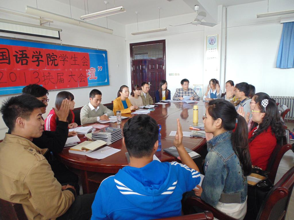 2013年10月15日中午12点40分,tyc41183太阳成集团学生会换届大会在11号楼214会议室举行,这次大会由学生会组织召开,tyc41183太阳成集团党总支副书记陈慧、tyc41183太阳成集团辅导员刘爽、张振华老师及学生会各届部长部员参加了会议。