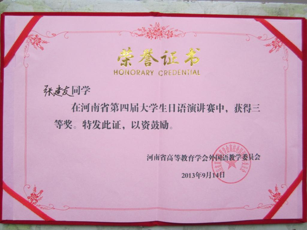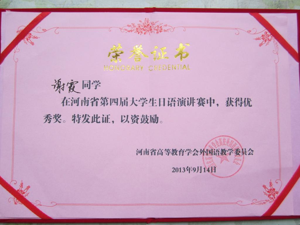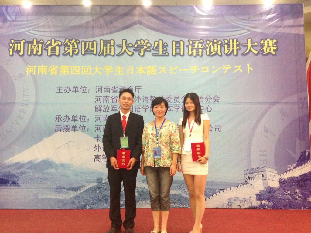 2013年9月14日,第四届河南省大学生日语演讲比赛在焦作成功举办,本次大赛由河南省教育厅及高等教育学会外国语教学委员会主办,河南理工大学承办,吸引了众多高校学生参赛。tyc41183太阳成集团日语系10级学生谢霞和张建友同学代表学校参赛。大赛分为主题演讲和即兴演讲两个环节,上午的主题演讲环节各位选手旗鼓相当、难分伯仲,下午的即兴演讲环节将大赛推向了高潮。在带队老师于勇的悉心指导下,张建友和谢霞同学发挥稳定、表现突出,分获三等奖和优秀奖。
