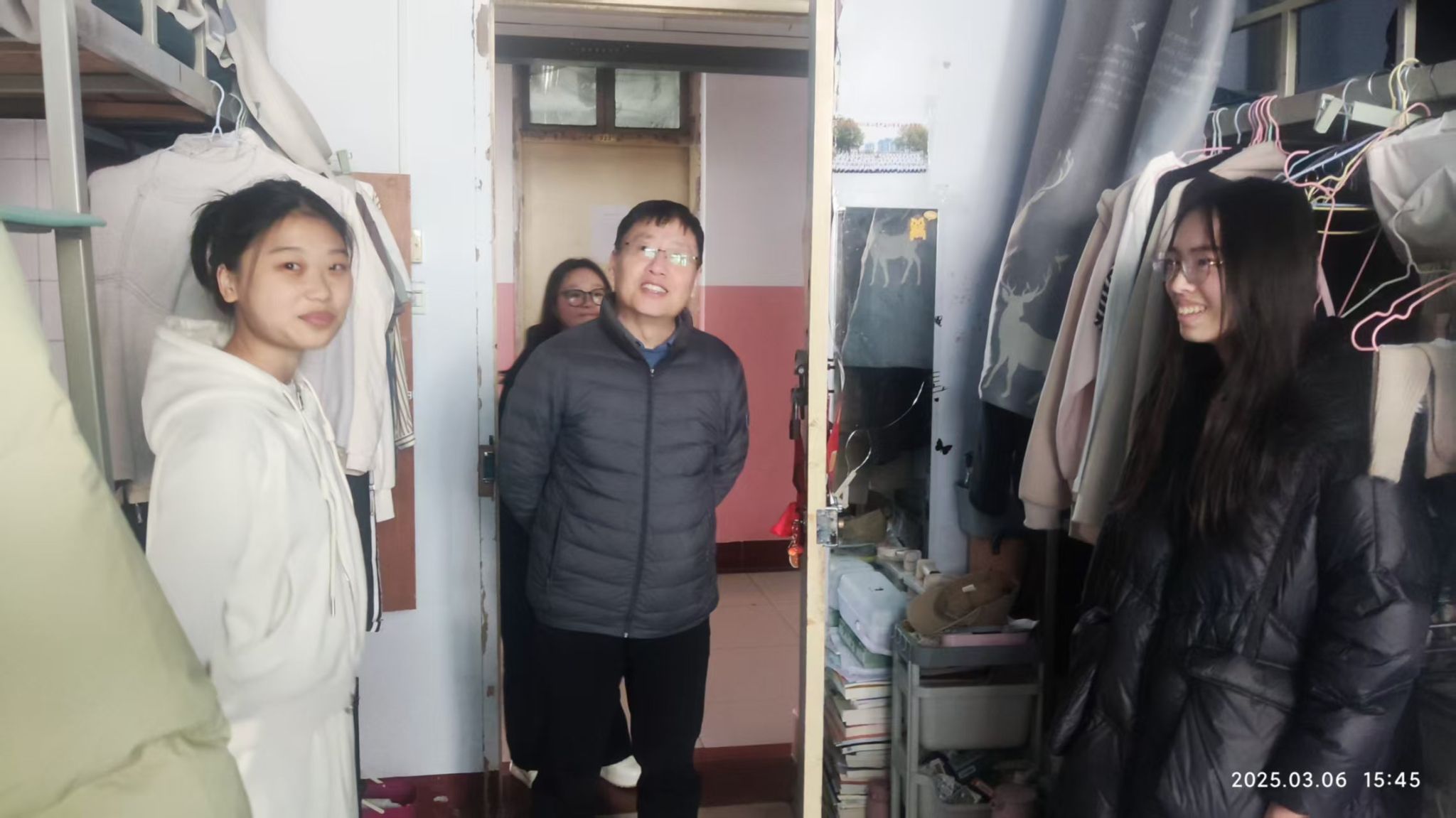学期伊始,为进一步了解学生宿舍环境,倾听学生心声,切实提升学生管理与服务水平,2025年3月6日,学院党委书记卢世海、副书记常潞炜及辅导员葛士阳走访学生宿舍,与同学们面对面交流,关心学生成长生活。
