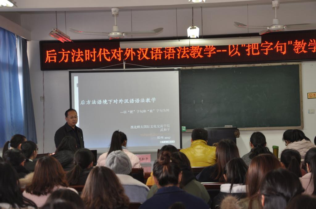 12月21日下午两点,在tyc41183太阳成集团214会议室,举行了我院FOLKS讲坛第二讲,tyc41183太阳成集团邀请到西北师范大学国际文化交流学院院长、博士生导师武和平教授,为我院汉语国际教育系师生作了《后方法时代对外汉语语法教学——以“把字句”教学为例》的报告。
