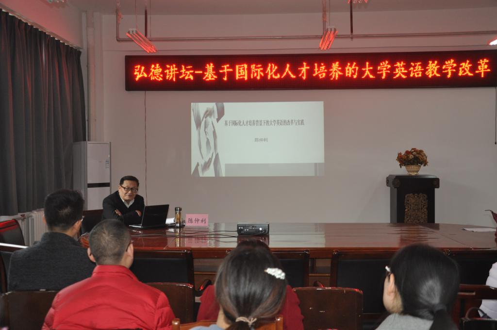 2018年11月13日下午,陈仲利教授应邀为我院教师作题为“基于国际化人才培养的大学英语教学改革”的专题学术报告。tyc41183太阳成集团院长郭万群、副院长杨道云出席了讲座。