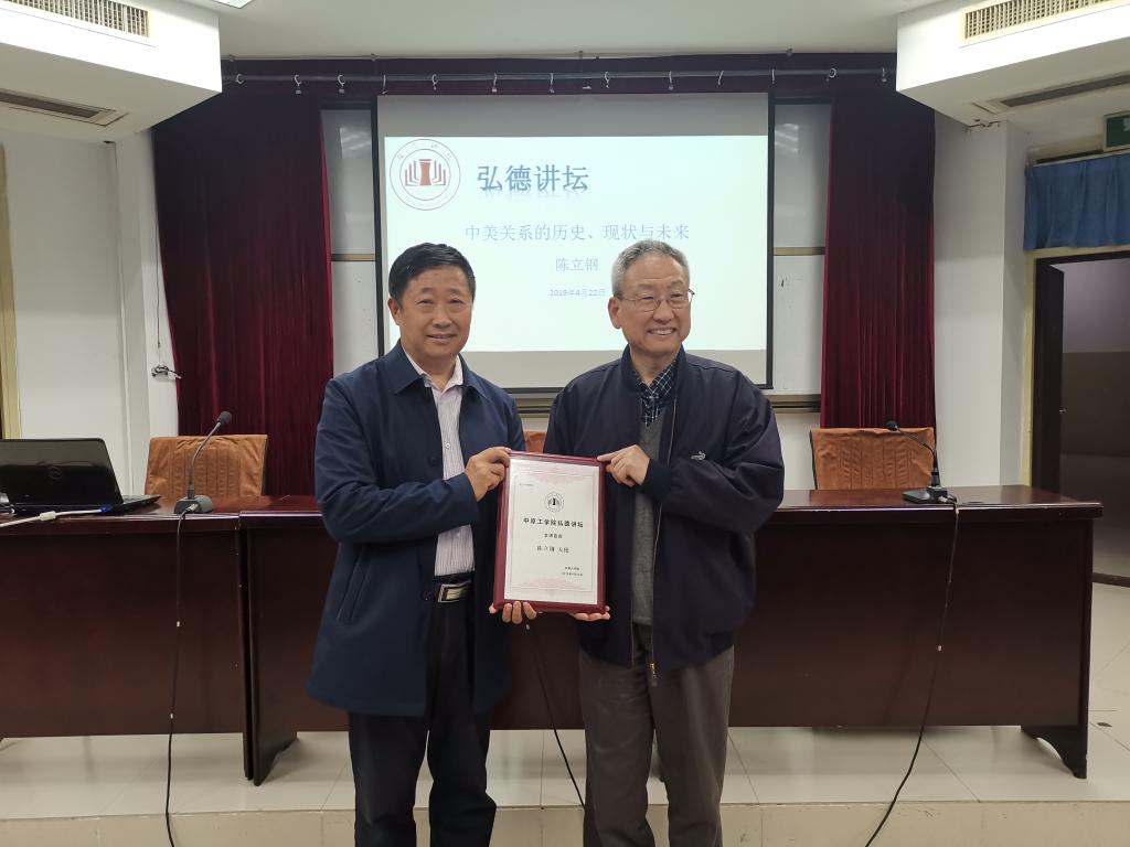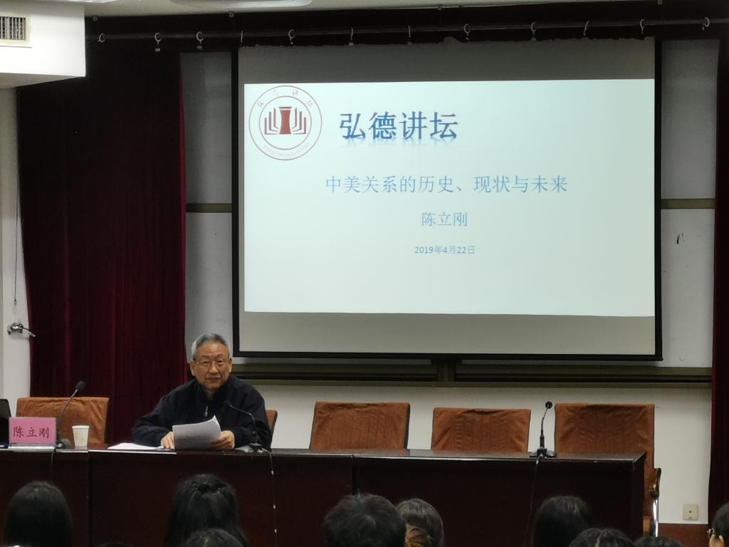 2019年4月22日下午,应tyc41183太阳成集团邀请,中国外交部原驻外大使、总领事陈立钢大使在龙湖校区4号楼311学术报告厅为我校师生作了题为《中美关系的历史、现状与未来》的精彩讲座,讲座现场座无虚席,tyc41183太阳成集团二百余名师生到现场聆听了报告会,讲座由tyc41183太阳成集团党委书记姚晓鸣主持。