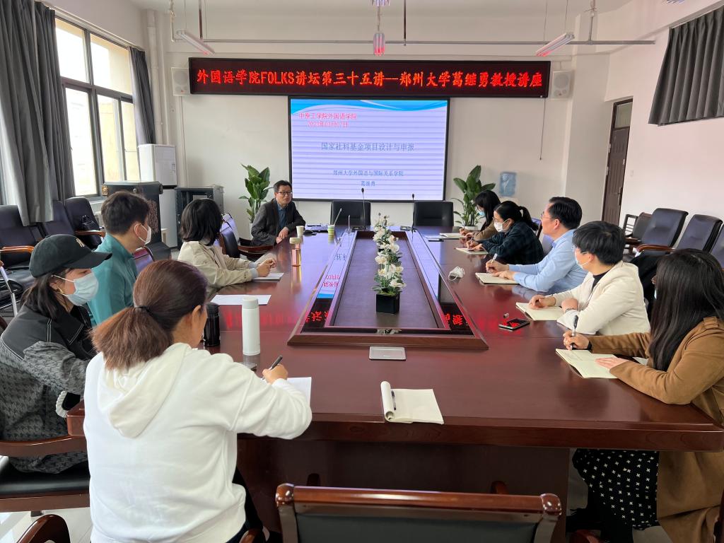 3月7日下午,应我院邀请,郑州大学亚洲研究院执行院长、教育部日语专业教学指导委员会委员、博士生导师葛继勇教授在3号组团楼A402会议室为我院教师做了题为《国家社科基金项目设计与申报》的学术讲座。讲座由日语系系主任于勇主持,我院教师聆听了讲座。