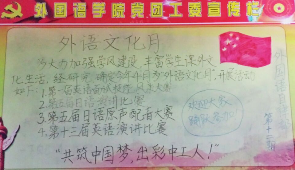 本期板报主题主要是外语文化月,该主题不仅迎合了正在组织的外语文化月活动,而且也相当于对此作了一次宣传,由于此板报位于宿舍,且正好是外语学院大部分学生生活的场所,在此宣传无疑是一种极佳的选择。 更能达到宣传效果,也发挥了板报本身的作用。